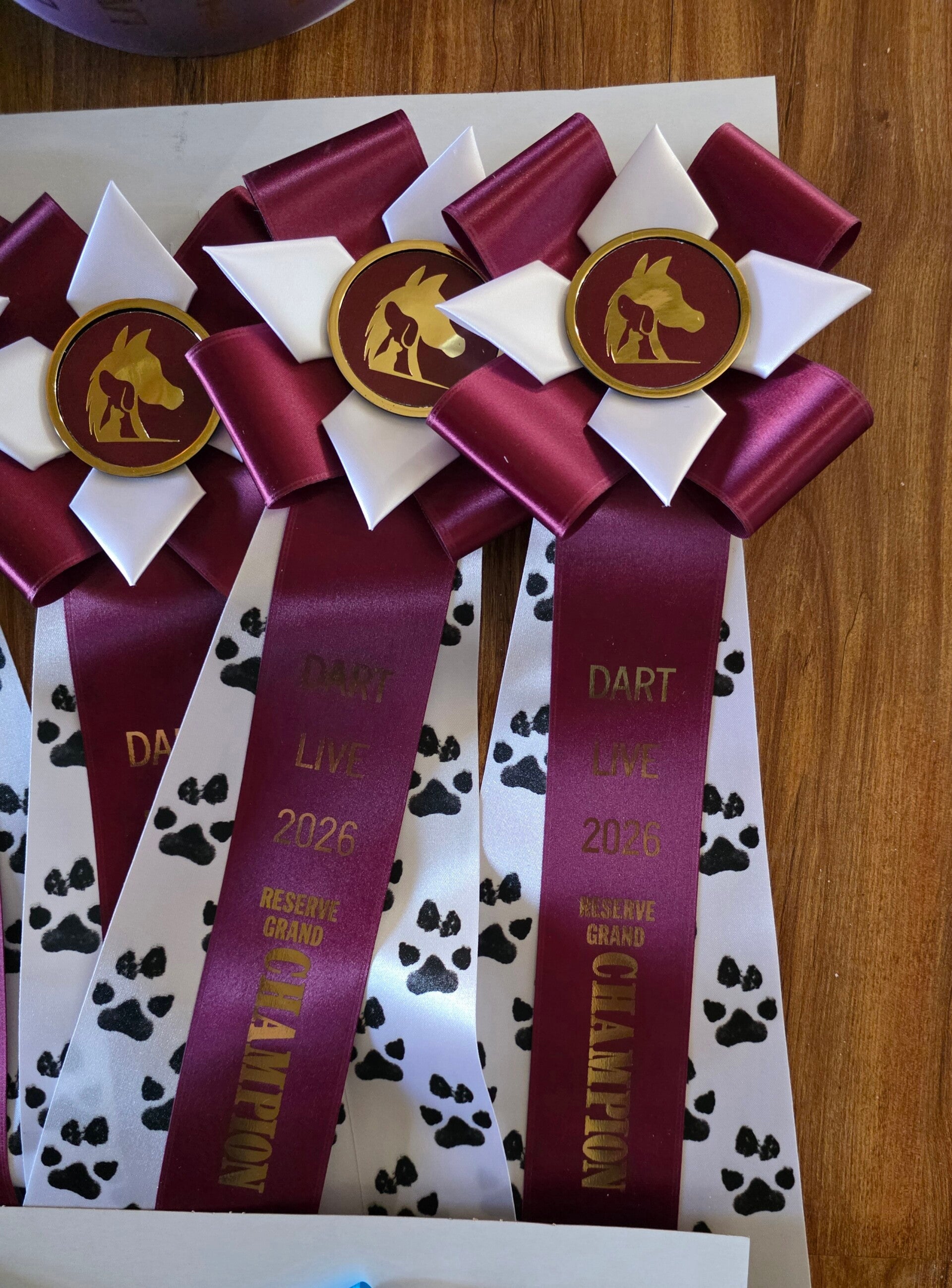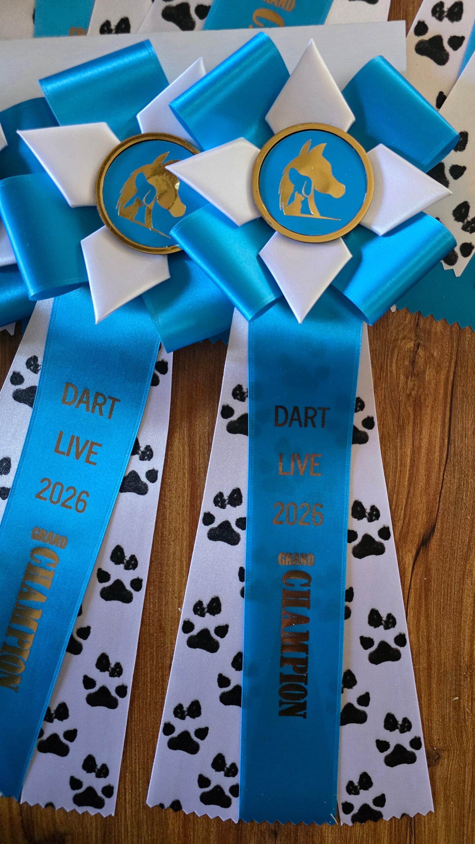 The esteemed Class Champions and Reserves are honored with exquisite satin flats, featuring the DART logo and special paw pads, a subtle yet meaningful tribute to the animal rescue efforts we passionately support. Additionally, our overall awards include large, beautiful rosettes prominently displaying the DART logo, complete with elegant paw pad streamers, symbolizing not just victory, but a cause close to our hearts.